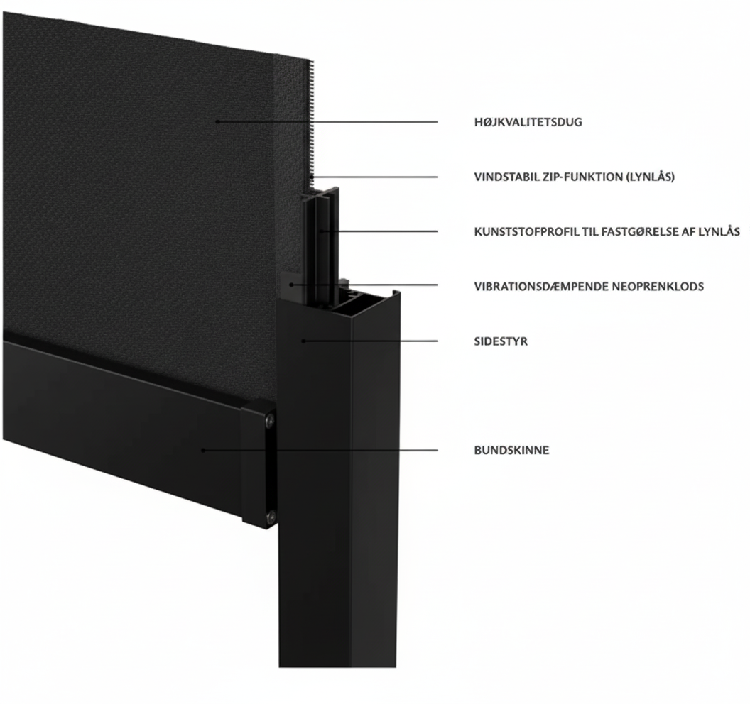 Her finder du de vigtigste detaljer om, hvordan vores zip-screens er bygget op, og hvorfor de fungerer så godt i det danske klima. Vi forklarer tingene i et sprog, der er let at forstå, så du hurtigt kan se, hvad der gør forskellen i hverdagen – fra den robuste kassette og vindstabile sideskinner til den motoriserede betjening og holdbare dug.